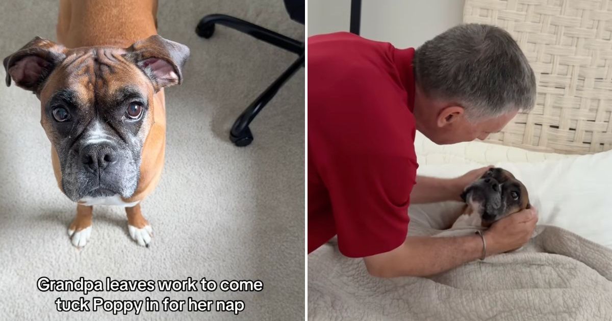 A cute dog only wanted her grandpa to tuck her into bed, and the precious moment, which was captured in a video, is now melting hearts. Princess Poppy, a gorgeous Boxer, has continued to leave everyone awestruck with her sweet shenanigans. The fur baby is truly spoiled, and a recent video gave a glimpse of her grandpa’s loving gesture for her. Poppy clearly adores him equally. Netizens were quick to catch the way the canine looked at her grandpa with heart eyes.