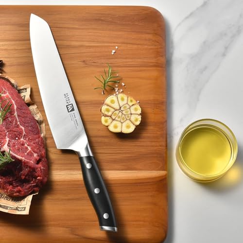 This set includes a range of knives tailored to numerous kitchen tasks. You’ll find an 8″ Chef’s Knife, an 8″ Bread Knife, an 8″ Carving Knife, and two Santoku knives (both 7″ and 5.5″), along with a 3.5″ Paring Knife and eight 4.5″ Steak Knives. Additionally, the inclusion of Kitchen Scissors, an 8″ Sharpening Rod, and a solid wooden block makes this kit all-inclusive for both meal prep and dining.