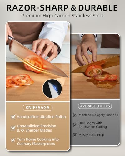 At the core of the KnifeSaga set is its revolutionary NextGen forged steel, developed using cutting-edge technology. These professional-grade blades are not only incredibly sharp—maintaining their edge for over 5 years—but also resistant to chipping and curling. The satin-finished high carbon stainless steel provides a stain-resistant surface that is easy to maintain, ensuring your knives look as good as they perform. For buyers looking for longevity and reliability in kitchen tools, this aspect alone could justify the investment.