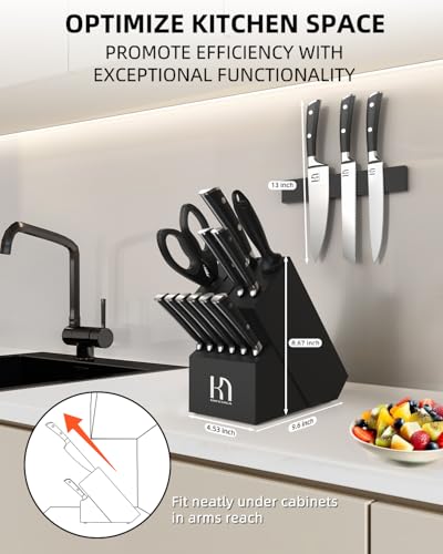 With 15 pieces—including an 8” Chef Knife, 7” Santoku Knife, Bread Knife, Utility Knife, Paring Knife, six Steak Knives, Kitchen Shears, and a Knife Sharpener—this set covers all your culinary tasks. Housed in a sturdy black acacia wood block with a non-slip bottom, it not only protects your knives but also adds a modern aesthetic to your kitchen. For long-lasting performance, it is advisable to hand wash these knives.
