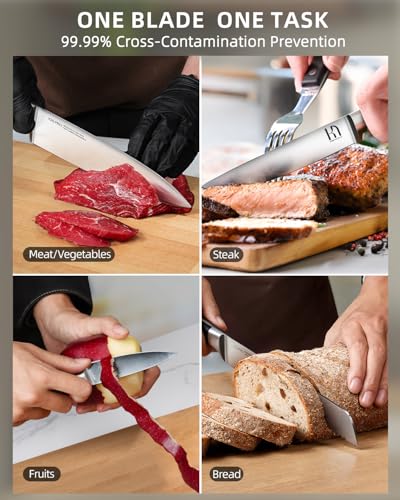 What sets this knife set apart is its unique 10° blade angle, achieved through a combination of heat treatment technology and meticulous hand precision grinding by senior craftsmen. This design allows for smooth cutting of meat and even breaking bones with ease, enabling you to save over 50% of energy while slicing through tougher materials. This feature makes the KnifeSaga set particularly appealing for those who may find traditional knives cumbersome, such as elderly cooks or those with limited strength.